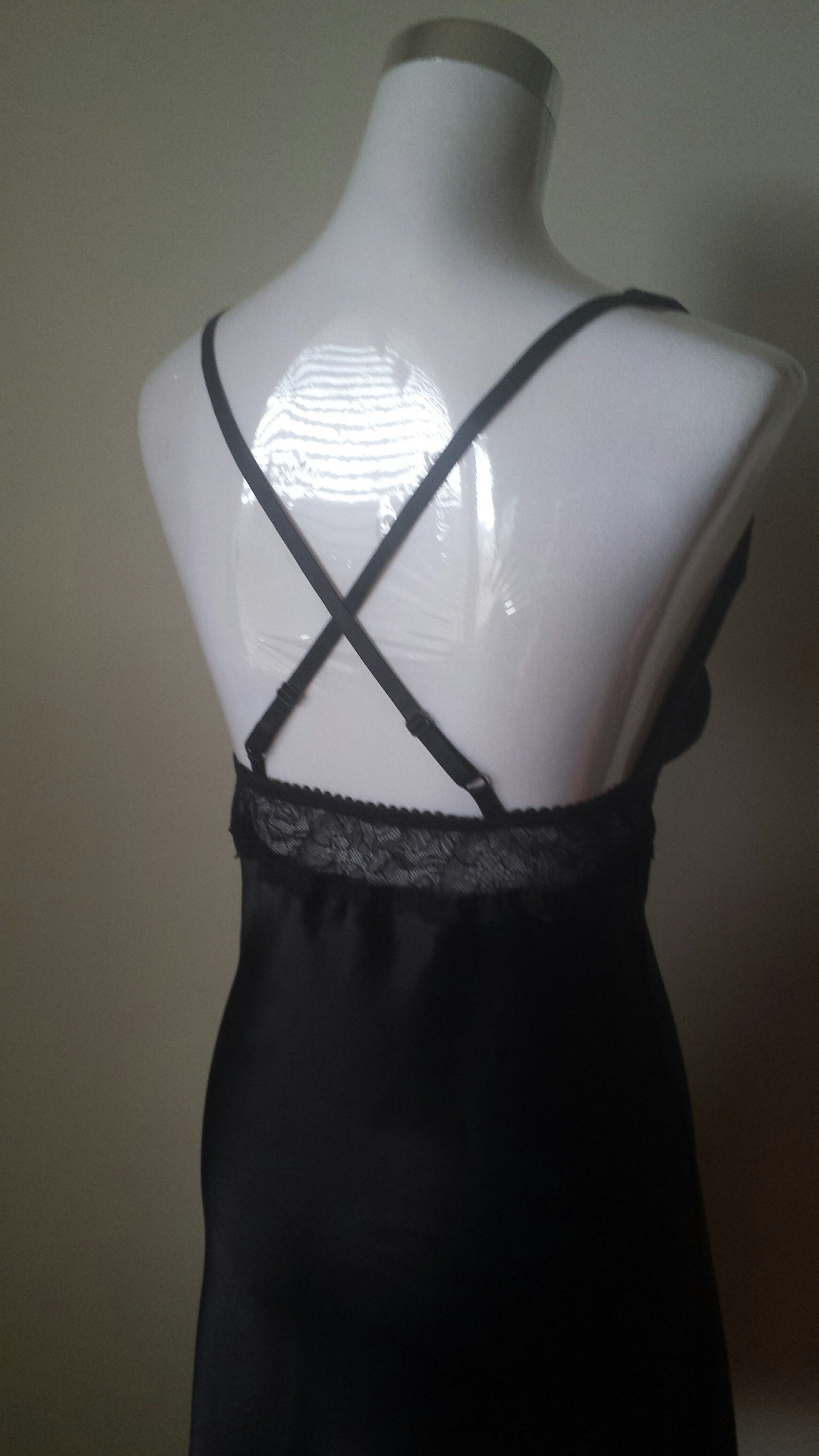 From Sally Jones Lingerie, this beautiful silk nightie is hand made in Australia using the finest silks and laces. The bra cupped bodice has a deep V neck and finishes at the top with fully adjustable shoulder straps that are crossed at the back. A band of beautiful black lace sits under the bust and is elasticised at the back to hold the bust in. The bust cups will hold up to DD bust. Lace edging is used at the hem. This nightie measures approximately 95cm in length and sits just on or above the knee depending on the height of the wearer.